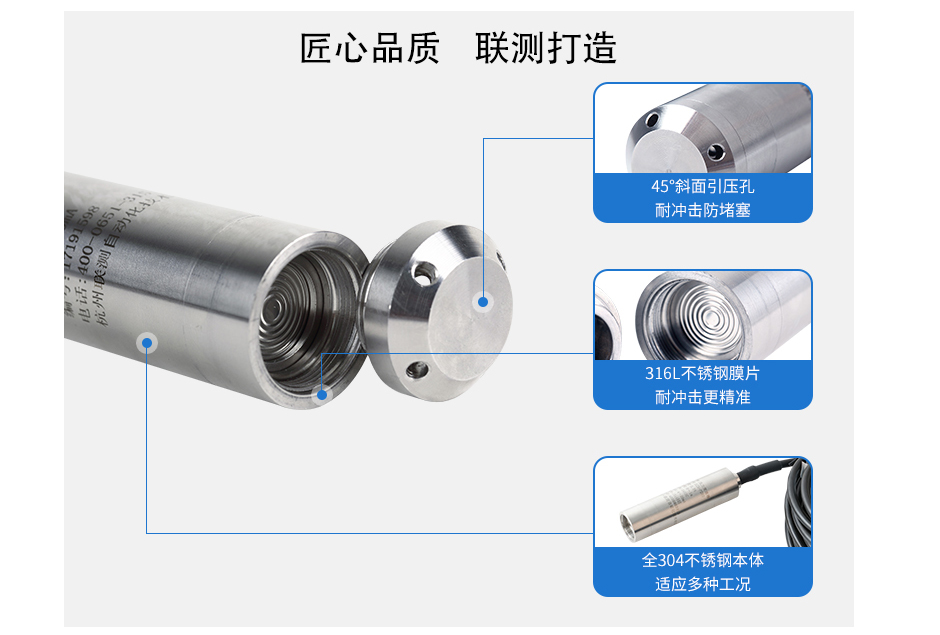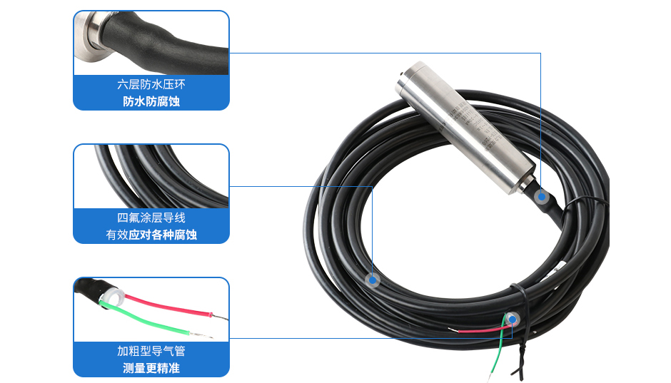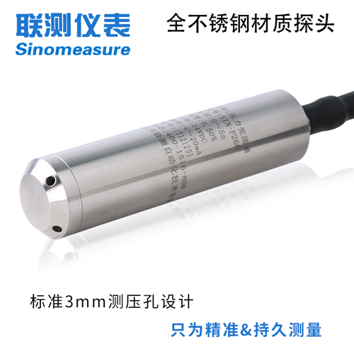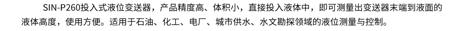 產品簡介:SIN-P260投入式液位變送器由高性能擴散硅壓阻式壓力傳感器作為測量元件,把與液位深度成正比的液體靜壓力準確測量出來,并經過信號調理電路轉換成標準(電流或電壓)信號輸出,建立起輸出信號與液體深度的線性對應關系,實現對液體深度的測量。