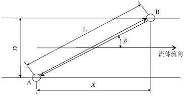 如圖1所示,為管道式安裝的超聲波流量計測量時的示意圖,可以清楚的表示出超聲波在傳感器探頭A和B之間的管道內傳播的簡化幾何關系。其中,超聲波傳播的聲道與管道的軸線間夾角為β,管徑為D。